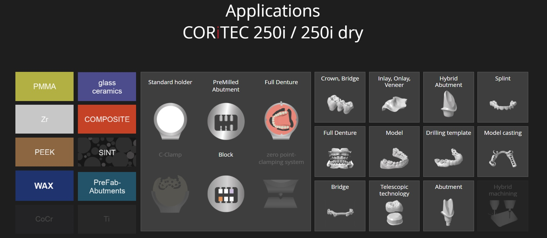 Zirconium dioxide, aluminium oxide, PMMA, plastics, composites, wax. Glass ceramics, hybrid ceramics. |